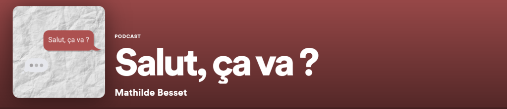 Une nouvelle chaîne de podcast qui vient d’être crée par « Mathilde Besset, psychologue clinicienne » qui vient d’être publié il y a, à peine quelques jours. J’ai été très contente de découvrir ce nouveau podcast « Salut, ça va ? » Elle aborde des thèmes sur notre état psychologique de la vie quotidienne. Dans cet épisode, elle nous parle du regard des autres et de l’impact qu’il peut avoir dans nos vies. C’est un sujet fort intéressant et très actuel. Je vous laisse découvrir cette jeune chaîne de podcast qui j’espère deviendra grande.